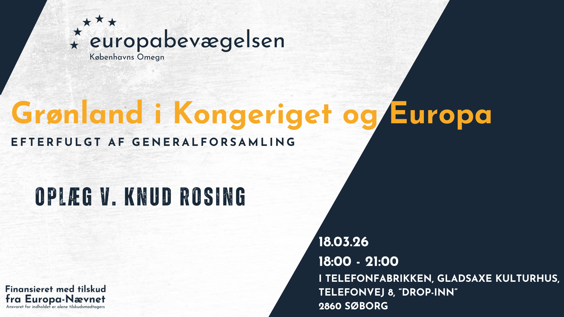 Vi har inviteret Knud Rosing, Grønlænder og Grønlandsekspert, til at fremlægge sine tanker og visioner for Grønlands fremtid i det Danske Kongerige, Europa og USA inden vi går i gang med den officielle dagsorden. Alle, uanset medlemskab, er velkomne til at deltage i oplægget.